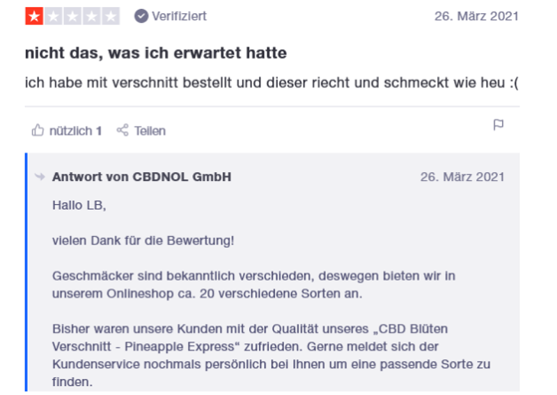 Bei CBDNOL merken Kunden an, dass die Qualität gut ist. Zudem fällt auch der angenehme Geschmack positiv auf.