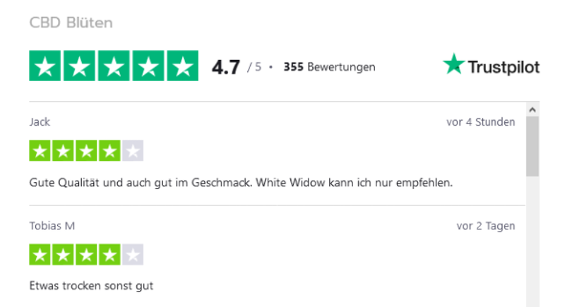 Auch Trustpilot bietet Dir viele Vergleichswerte verschiedener CBD Blüten Anbieter.
