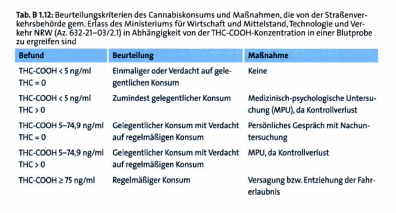 Bereits ein THC-Wert von 1 ng/ml im Blut kann zum Entzug der Fahrerlaubnis führen, wenn gelegentlicher oder regelmäßiger Konsum vermutet wird. Einen Toleranzabzug gibt es nicht.